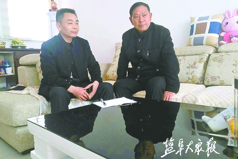 △东台台办工作人员来到焦家中了解顾家情况。图为焦恒美(右)向冯少美(左)讲述当年往事。