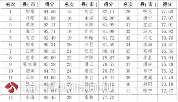 而在41个县(市)中,得分前5名的分别是如皋、丹阳、溧阳、海门和海安,最后五名为灌南、阜宁、建湖、射阳和睢宁。