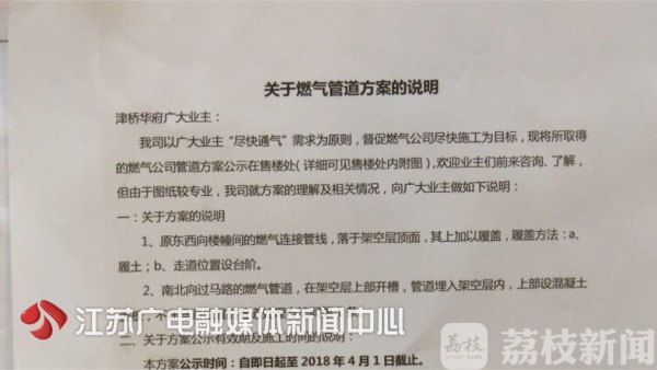 上午,记者在现场看到,架在小区半空中的燃气管道已经拆除。在南京金轮津桥华府售楼处内,开发商贴出了整改方案的公示,不少业主第一时间赶来了解最新情况。