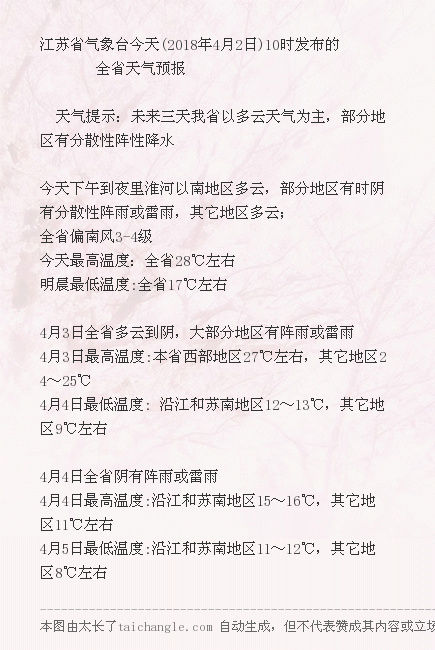 今天,江苏会出现分散性雷阵雨,早上北部仍会有大雾出现,白天的气温维持较常年偏高的状态,部分地区的最高气温仍会在30℃边缘试探。今天下午到夜里淮河以南地区多云,部分地区有时阴有分散性阵雨或雷雨,其它地区多云;全省偏南风3-4级,今天最高温度:全省28℃左右,明晨最低温度:全省17℃左右。
