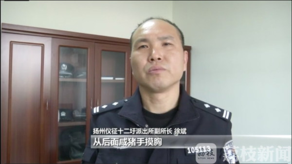 扬州仪征十二圩派出所副所长徐斌介绍,3月25号下午,一名女子报警称自己路遇色狼。“(该女子)在路上散步的时候,被一个男子从后面‘咸猪手’摸胸。”