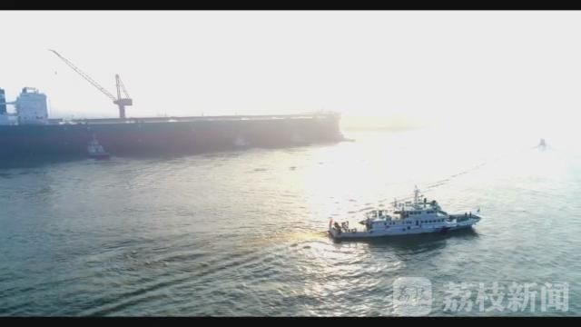 由于船体巨大,船舶离开码头时不能启用自身动力,只能依靠五艘拖轮从不同角度对它进行拖拽、顶扛,让船身缓缓进入长江主航道,然后再开启自身动力航行。为了保障巨轮顺利首航,泰州海事部门不仅安排海巡艇全程维护,还协调沿途海事机构船舶交通管理中心对它进行重点监控,提醒过往船舶注意避让。今天江面上天气晴好,风力和能见度都比较适合船舶航行,这也给试航的顺利进行提供了便利。