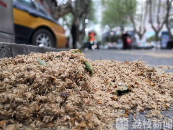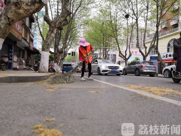 今天(4月4日)早上,记者在句容城区的北大街看到:梧桐絮在风中飞舞,不少行人纷纷戴上了口罩,地上也铺上了厚厚的一层。环卫工人们正在风中进行大面积清扫,他们有的挥动大笤帚扫地,有的将花絮装进垃圾车。