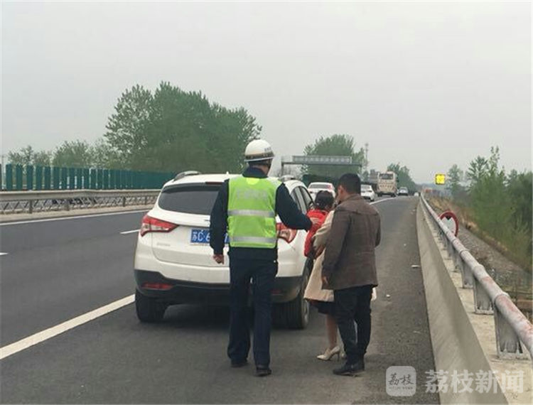 4月5日10:30,连徐支队执法人员王德永、孟庆雪在巡查至连徐高速公路K162+400处时,发现一男一女站在高速公路紧急停靠带内激烈争吵,女子情绪失控,男子试图将她拉回紧急停靠带,但女子抱着孩子背对来车方向不停高速公路行车道中间走去。此时,正值清明小长假,车流量比较大,情况非常危险。