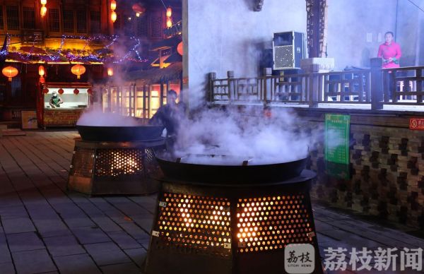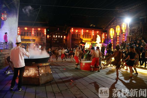 芳菲四月品山菜,昨天夜幕降临,句容宝华山千华古村里是花街灯如昼。在古戏台旁,人们点燃起篝火,支起两口大锅,现场烹饪具体特色的“江苏山野菜第一锅”。游客们看着古老的部族民间表演、听着原汁原味的戏曲联唱,等到“山野菜第一锅”正式开锅,人们争相品尝,在山野菜的美味中感受一番春天的滋味。