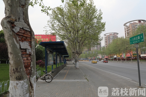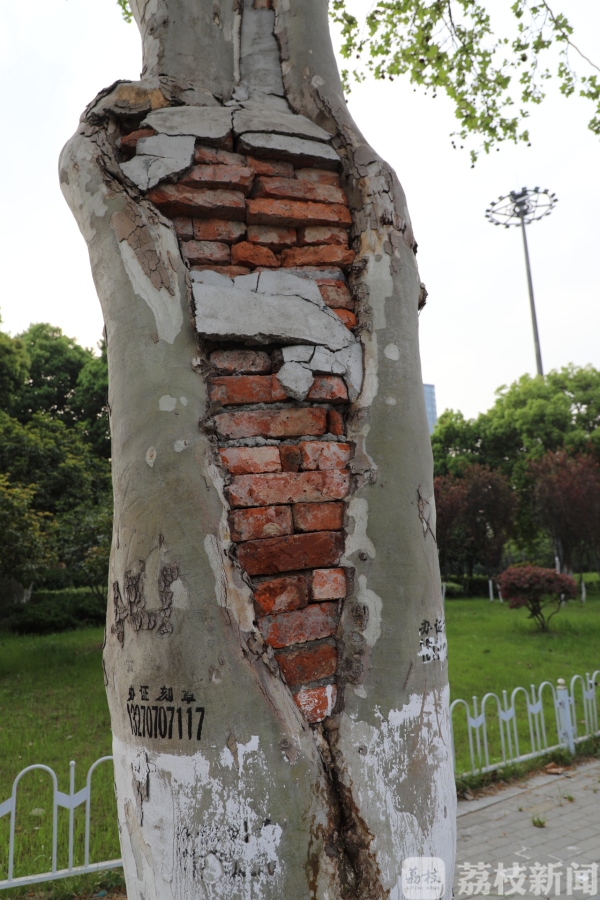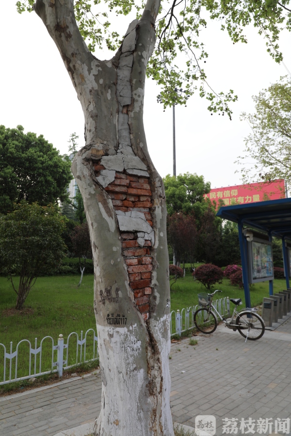 在南京大桥北路时,荔枝网友看见了奇怪的一幕:路边一棵梧桐树,树干中部有个很大的窟窿,但窟窿里却塞满了红砖块。裸露在外的红砖与树皮极不相称,视觉上也十分不雅观。