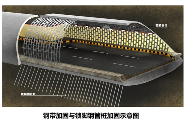此外,其中一份文件提到的处治方案为“采用二次衬砌表面粘贴钢带+微型钢管桩加固”,文件还附上了钢带加固与锁脚钢管桩加固示意图。