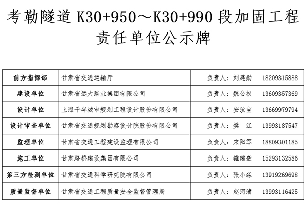 4月7日,甘肃省交通运输厅在其官方网站上发布了《考勒隧道K30+950~K30+990段加固工程责任单位公示牌》《考勒隧道K30+950~K30+990段加固工程质量公示牌》等6份文件供公众下载,其中包含各责任单位负责人姓名、手机号码等信息。