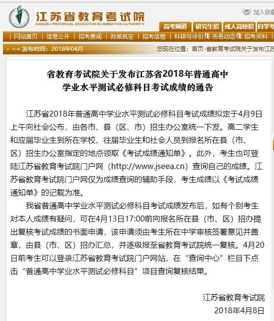 江苏省2018年普通高中学业水平测试必修科目考试成绩拟定于4月9日上午向社会公布,由各市、县(区、市)招生办公室统一下发。高二学生和应届毕业生到所在学校、往届毕业生和社会人员到报名所在县(市、区)招生办公室指定的地点领取《考试成绩通知单》。此外,考生也可登陆江苏省教育考试院门户网(http://www.jseea.cn)查询自己的成绩。江苏省教育考试院门户网仅为成绩查询的辅助手段,考生成绩以《考试成绩通知单》的记载为准。