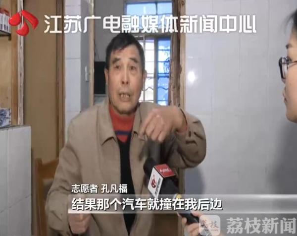 志愿者孔凡福告诉记者:“我就用电动车把他们拦住,我如果不拦那两个人,至少要撞到一个,危险得不得了。我当时在马路中一看是黄灯,马上掉头,结果那个汽车就撞在我后边。”经医院诊断,孔凡福腰椎骨折,需要卧床休养,前前后后共花费医药费1300元。