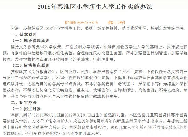 日前,南京市各辖区2018年义务教育招生入学工作实施方案陆续出台,截至今天下午,在已经出台方案的各区中,家长最为关注的各学校施教区划分和去年相比基本没有变化。各区的招生细则体现出“宽”、“严”结合的特点。“宽”主要针对学生,即只要符合相关条件的学生都能有学上,都能上好学,“严”主要针对学校,在招生过程中,各区明文规定“六个不准”。