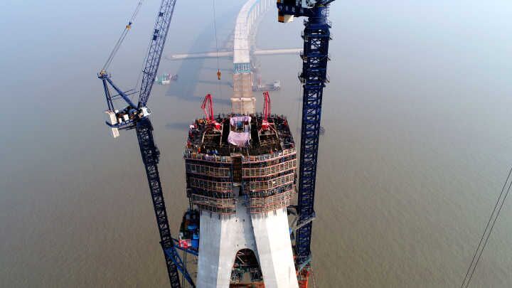 沪通长江大桥主航道桥跨度1092米,主航道桥6座桥墩基础均采用沉井基础施工。当前,28号墩主塔的“姊妹”塔29号墩主塔正在进行下横梁施工,高度达到54米。