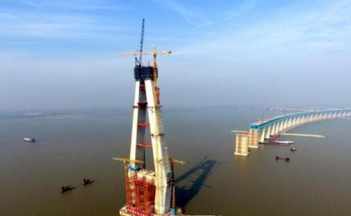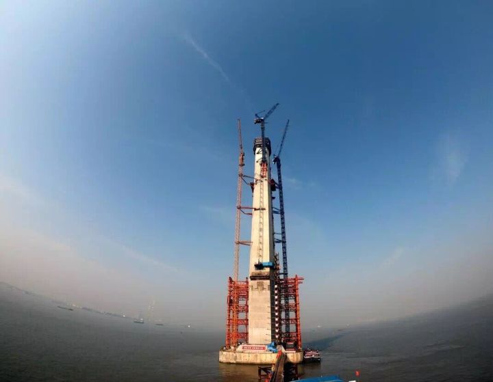 目前,28号墩主塔施工标高已经达到了245.5米,离主塔封顶还有16节,预计将会在9月底完成主塔封顶。届时,主塔高度将会达到325米。