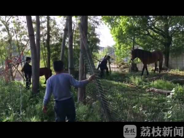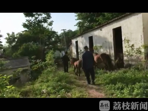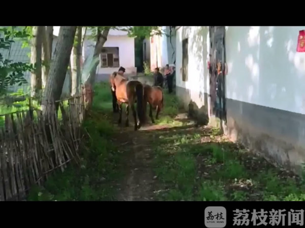 4月19号下午3点,南京栖霞区摄山派出所接到辖区市民孟北同心村张女士报警,称她家门口来了两匹马,大的是母马,小的是公马,将她家田里的菜都吃了,民警接警后迅速赶到现场。