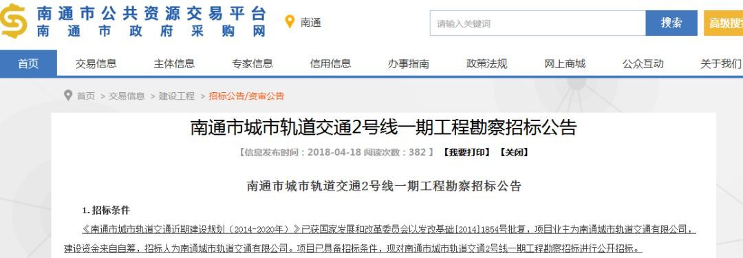4月18日,南通市城市轨道交通2号线一期工程勘察招标公告发布。