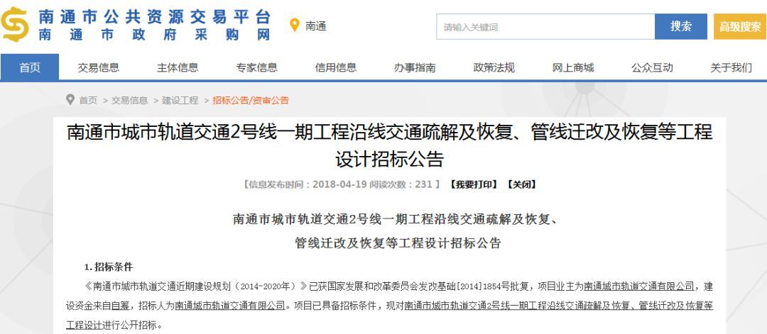 4月19日,南通市城市轨道交通2号线一期工程沿线交通疏解及恢复、管线迁改及恢复等工程设计招标公告发布。