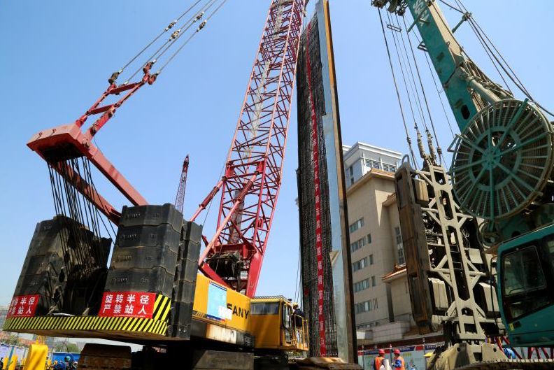 上午10点,位于工农路和濠南路交叉口北侧的中级法院站,中铁十七局集团中级法院站工区人头攒动。成槽机连日作业,挖出长6米、宽0.8米、深42米的槽孔后,驶离现场。清孔,换浆、超声波检测等一系列工序完成后,10点20分左右,吊机用钢索缚住39米高的钢筋巨笼,缓缓拉起。经过一个多小时吊装作业,钢笼顺利插入槽孔,等待浇筑砼。