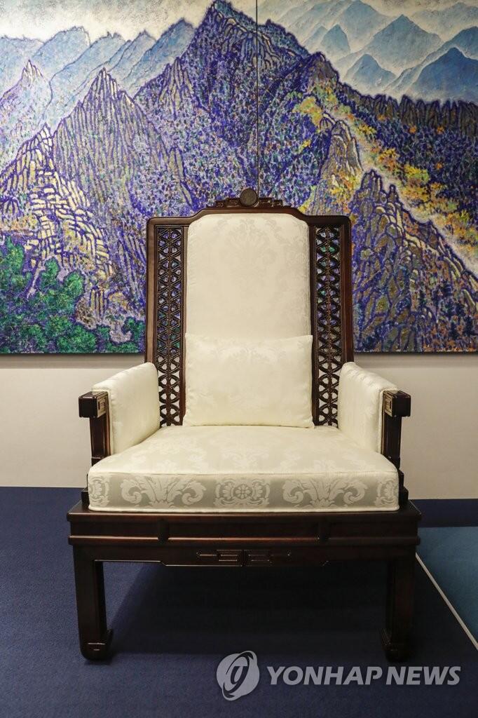 文在寅和金正恩所坐的椅子为韩国传统家具,设计象征着连接,最上方刻有半岛地图,独岛也包含在内。
