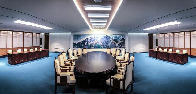 韩联社4月25日报道称,会议桌形状为宫殿的桥墩护栏,由两座桥搭成一座桥制成。会议桌最宽处为2018mm,象征着半岛从2018年迎来和平。会议室墙壁上悬挂画家申璋湜的作品《从上八潭看金刚山》,室内整体装饰主题为传统韩屋。