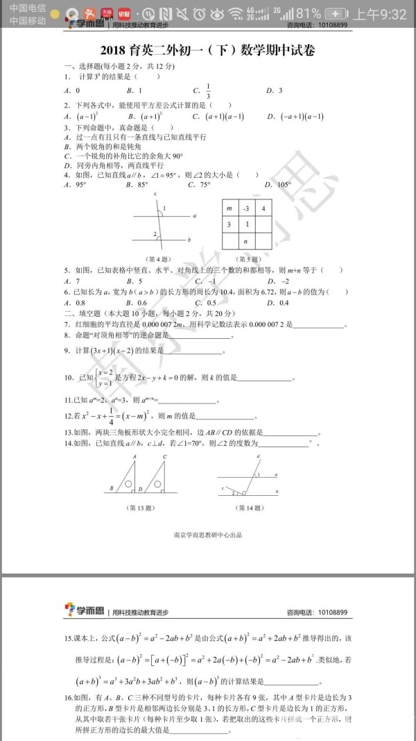 今天(4月25日)上午,一张印有南京学而思水印的2018育英二外初一(下)数学期中试卷刷爆朋友圈。这张试卷昨晚就从南京学而思流出,而南京市鼓楼区进行初中联合调研考试数学科目今天上午才举行。