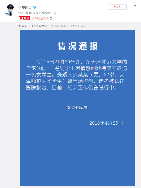 4月25日21时20分许,在天津师范大学图书馆3楼,一名男学生因情感问题持菜刀砍伤一名女学生。嫌疑人范某某(男,22岁,天津师范大学学生)被当场控制,伤者被送往医院救治。目前,相关工作仍在进行中。