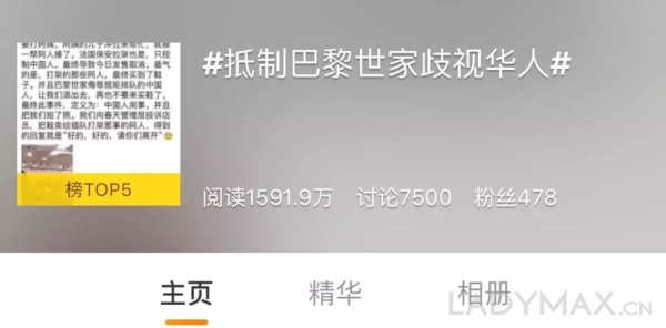 截止到今天下午三点,#抵制巴黎世家歧视华人#的微博话题现已跃居热门话题榜第五位,累计获得1591.9万的关注