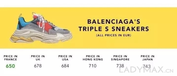 目前Triple S 的平均售价已超过650欧元,约合人民币5153元。大量中国消费者选择在法国购买的重要原因在于当地的售价650欧元较中国香港的710欧元便宜近500元,而Triple S 在亚洲地区的价格均在700欧元以上。