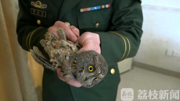 在扁担港边防派出所的值班室里,记者见到了这只装在网兜里的小鸟,看到有人过来,小鸟不停地走动,两只圆圆的大眼睛紧盯着记者的摄像机,有点像猫头鹰类,边防民警孙全江把小鸟从网兜里拿了出来,仔细的翻看了小鸟的全身,没有发现有明显的外伤。记者随即用手机拍摄了几张图片,发送给鸟类专家孙华金教授进行辨别。时间不长,孙教授电话里告诉记者,这是一只学名为东方角鸮的鸟类,是一种小型的猫头鹰,是我国体型最小的一种鸮形目猛禽,属于国家二级保护动物。