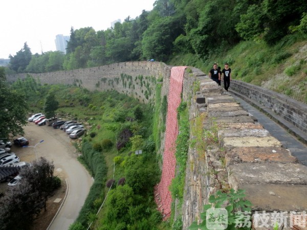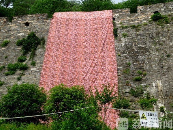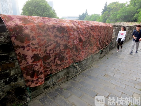 昨天(4月30日)下午4点左右,各地游客来南京很好奇,看见南京鼓楼区阅江楼古城墙上挂块大花布,不知是对古城墙上起到如何作用?