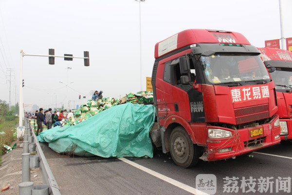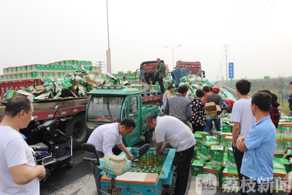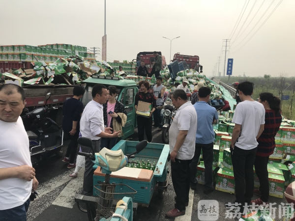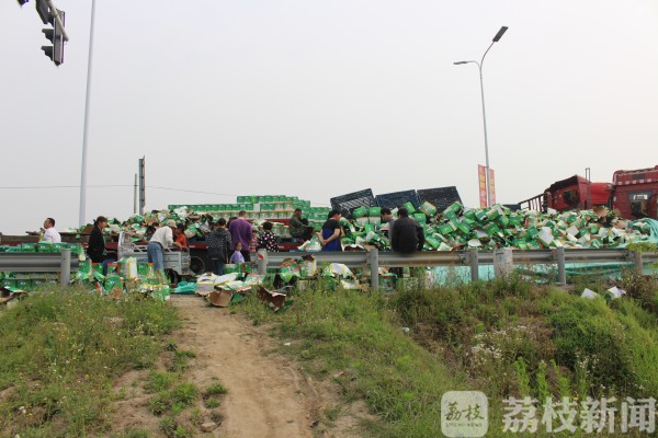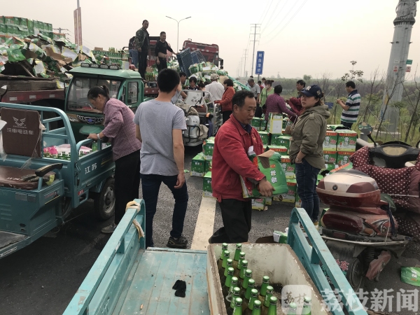 记者今天上午在现场看到,两辆大货车横亘在路上,占据半幅路面。车上车下全是啤酒箱子和啤酒,现场一片狼藉,有数十位附近村民将啤酒搬到三轮车和电动车上。附近村民说,车子上的啤酒卖2元一瓶,比平时便宜了很多,有很多村民来买啤酒。记者看到,有的村民,买了两三箱,有的买了上百瓶。