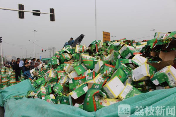 昨天(4月30日)下午3点左右,一辆安徽牌照的大货车满载二千六百箱啤酒,行驶在泰州市高港区金果路转弯时,由于惯性作用,一时间,二千多箱啤酒倾泻而出,全掉到路上了。今天(5月1日)清晨,货车老板决定,当场把破箱的啤酒降价卖给附近村民,以减少损失。