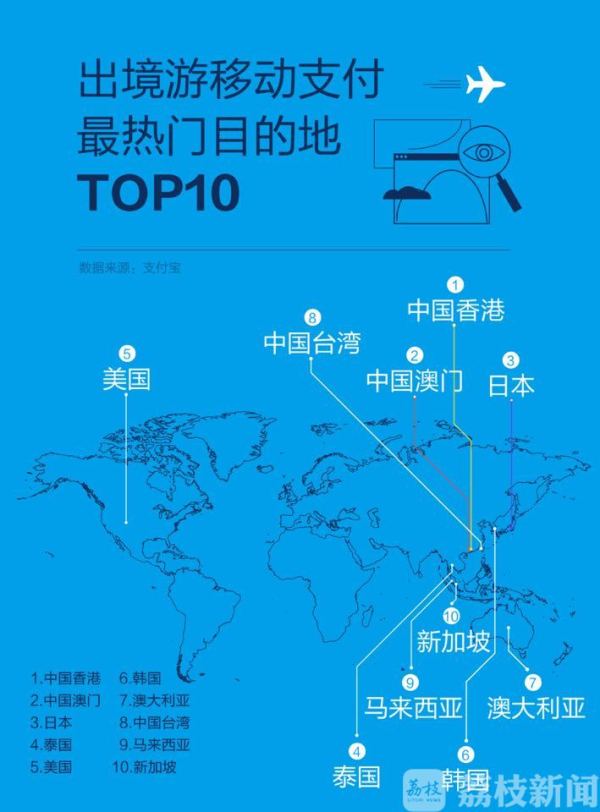 今天,支付宝发布“五一”小长假出境游移动支付数据报告。香港、澳门、日本分别列为最受欢迎的消费地前三位,其他依次为:泰国、美国、韩国、澳大利亚、台湾、马来西亚、新加坡。而南京人去的最多的则是美国、日本、澳大利亚,其中,赴美国消费用户比2017年“五一”期间增长了59%。