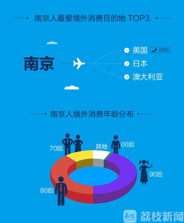出境游用户在数量上以沿海省份及发达地区为主力,其中出境游用户最多的城市是上海市,其他依次是广州、北京,南京位列第七。数据同时显示中国女性在境外比男性更爱消费,65%在境外消费的支付宝用户是女性;南京女人也不例外。此外,全国用户中90后占大多数,南京的90后也是境外消费主力军,占总数的近一半。
