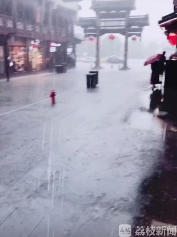 今天(5月1日)下午16点左右一场大暴雨突袭南京,原本夫子庙的游人已经非常多了,大雨落下的同时,街道上几乎不见一个人了,几乎夫子庙所有的店铺内都挤满了躲雨的游客,有一位在店铺内躲雨的游客戏称:“夫子庙上演了一场现实版的‘游客去哪儿了’” 。