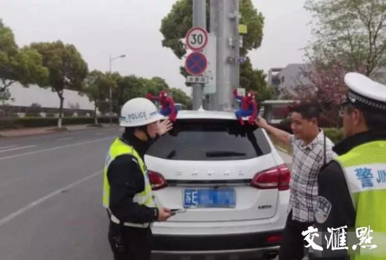 4月2日,苏州高新区狮山中队民警在辖区执勤时发现,一辆白色SUV在车顶后方安装了两个“蜘蛛侠”车顶玩偶,十分醒目。民警当即示意司机靠边停车,告知对方放在车顶的玩偶容易脱落,影响后车行车安全,同时很容易分散其他驾驶员的注意力,带来交通安全隐患。随后,民警要求司机现场拆除了玩偶,并依法对他“这类在行车过程中有妨碍安全行车的违法行为”处以记2分并罚50元的处罚。
