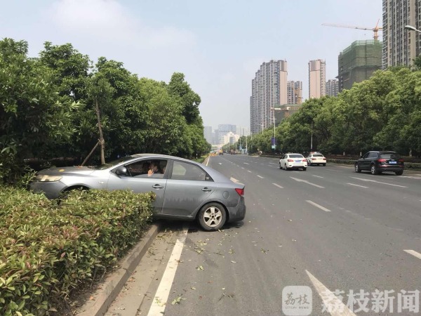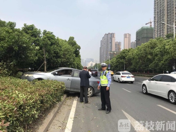 下午3时许,徐传辉在软件大队附近巡逻,从西春路左拐至软件大道时,发现一辆车牌为苏A446**的蓝色轿车卡在绿岛上, 车内被困两名老人。据了解,由于当天温度室外温度达到30度,驾驶员是一位患有多年高血压史的老人,在行车过程中,老人突发高血压,眼前突然一片模糊,情急之下操作失控,冲向了道路左侧的绿岛,由于车辆被绿岛卡住,车辆几乎与绿岛成90度,既占据一股车道影响通行,还存在巨大的安全隐患。