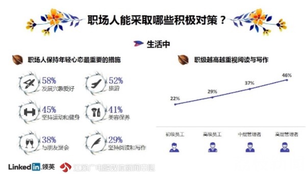 有哪些措施能够帮助职场人保持年轻的心态?数据显示:工作中,不断为自己设置目标、接受新挑战(52%),关注行业资讯、学习新知识技能(50%),以及积极社交、拓展人脉(42%)成为了职场人保持年轻最重要的措施;同时在生活中,职场人则多会选择发展兴趣爱好、旅游以及坚持运动健身。职级越高,采用这些措施的比例也越高。