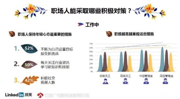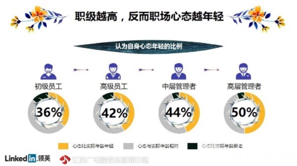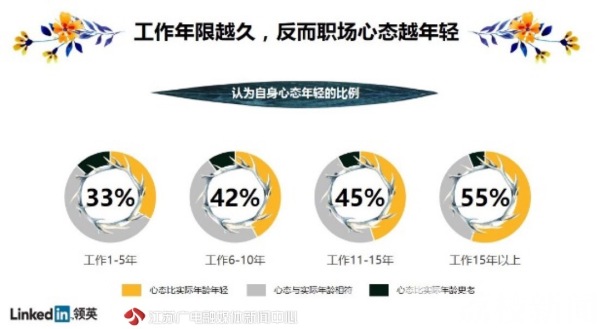 从“你被同龄人抛下”、“最后一批90后已成年”到“X年危机”,传递焦虑的话题总能迅速引起社会关注与热议。当今职场人竭尽全力地跟风追热点,渴望尽解永葆年轻的密码,生怕成为潮水退去后被落在沙滩上的那一个。为此,在五四青年节之际,从“年轻”出发,职场社交平台LinkedIn(领英)围绕当今职场人的心态展开了调查。数据发现,年轻无关年龄,一份年轻的“职场心态”才是保证不掉队的关键。工作年限越长、职级越高反而职场心态越年轻,这背后环境的影响至关重要。