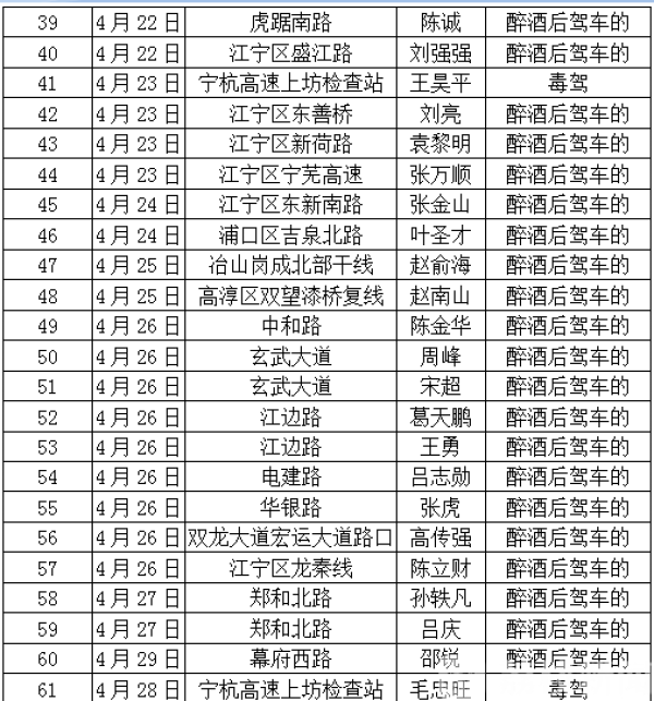 今天(5月3日),南京交警第八次对外公布“春雷行动”严重交通违法人员名单,此次共有83人被曝光,其中80人是因醉酒驾驶机动车被交警查处,还有3人是因为涉嫌毒驾被交警查处。这83人中年龄最小的24岁,年龄最大的56岁。