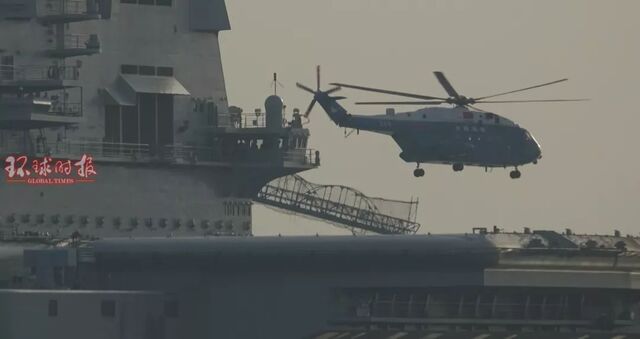 这是即将降落在国产航母甲板上的直-18改进型直升机,这款直升机在我海军“辽宁”航母上也使用,承担运输任务。