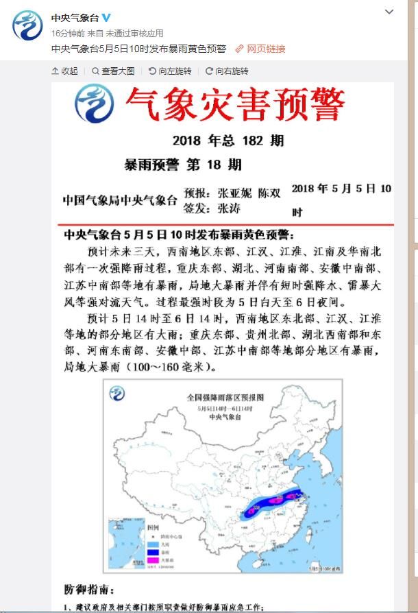 预计5日14时至6日14时,西南地区东北部、江汉、江淮等地的部分地区有大雨;重庆东部、贵州北部、湖北西南部和东部、河南东南部、安徽中部、江苏中南部等地部分地区有暴雨,局地大暴雨(100~160毫米)。