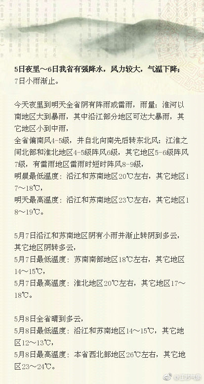 具体天气情况:5日夜里~6日江苏省有强降水,风力较大,气温下降;7日小雨渐止。今天夜里到明天全省阴有阵雨或雷雨,雨量:淮河以南地区大到暴雨,其中沿江部分地区可达大暴雨,其它地区小到中雨。请大家注意防范!