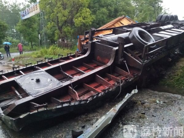 据附近村民介绍,夜里2点左右,突然听到一声巨大响声,开始以为是打雷,觉得不像,就跑出来看看什么情况,当他打开门定神一看,路面横着一辆大货车。跑到现场发现,驾驶员和副驾驶都困在驾驶室伤亡不明,并迅速帮忙报警。荔枝新闻网友在事故现场看到,平板车大约有20米长,上面装有木质包装箱,路面装载一些电瓶车,驾驶室已经严重变形,各种零配件洒落一地。