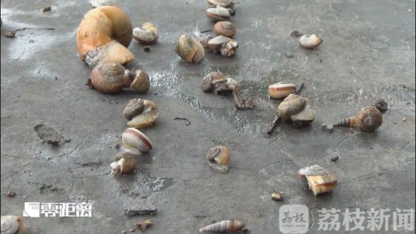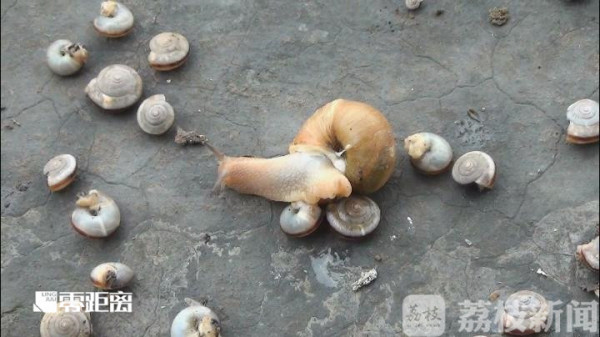 5月5曰下午1点左右,刚下过一场立夏雨,南京鼓楼水关桥附近市民出门时,发现大院花坛附近地上不知哪来了许多蜗牛。花坛边上、大路上密密麻麻的,上千只蜗牛冒着小雨来“聚会”。