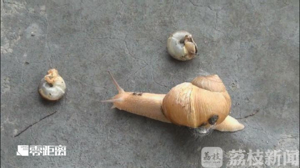 据居民姚大妈介绍,这些蜗牛只有指甲大小,在青草上、花坛边上,树干上爬行。如果行人不注意,一脚就能踩上5、6只,被踩碎的蜗牛壳发出啪啪的声音。