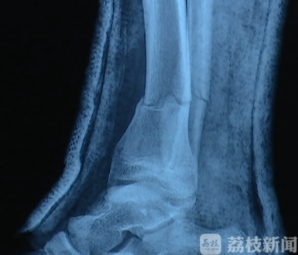 胡先生赶到医院后,发现儿子右腿被撞伤,医生拍片后诊断为:右胫腓骨远端粉碎性骨折。从片子上也明显能看到,距离脚踝两公分处,骨头明显断裂。在医生的建议下,小宇回家休养,进行保守治疗。事后胡先生了解到,小宇是被校园保安骑电动车撞伤的,监控也拍下了这一幕。
