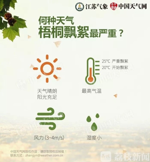 梧桐,作为行道树的一种在南京广泛种植。梧桐飘絮其实有两个来源,分别是三四月份的芽衣絮和五月中旬的果毛絮。梧桐树果球炸裂时,其中暗黄色、呈球状的果毛随风飞舞,就像下了一场“梧桐雨”。飘絮何时飘飞与气象条件关系密切,当最高气温在20℃以上时开始飘絮,气温达到25℃以上的时候飘絮严重。此外,风速在3~4m/s、空气湿度足够小、光照充足的时候飘絮最盛。