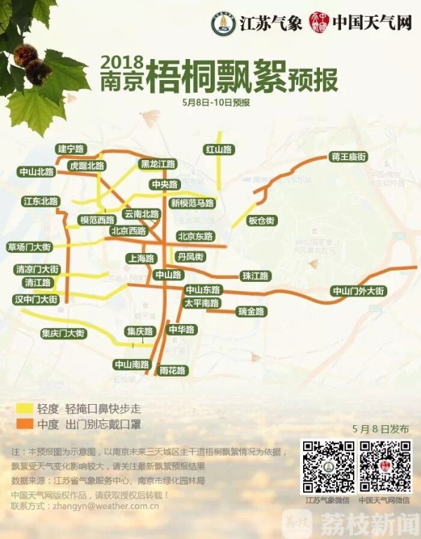 江苏省气象服务中心、南京市绿化园林局和中国天气网今天(8日)共同发布2018南京梧桐飘絮预报,综合天气、梧桐数量、树龄等各种条件,将飘絮预报等级分别为无、轻度、中度和重度。
