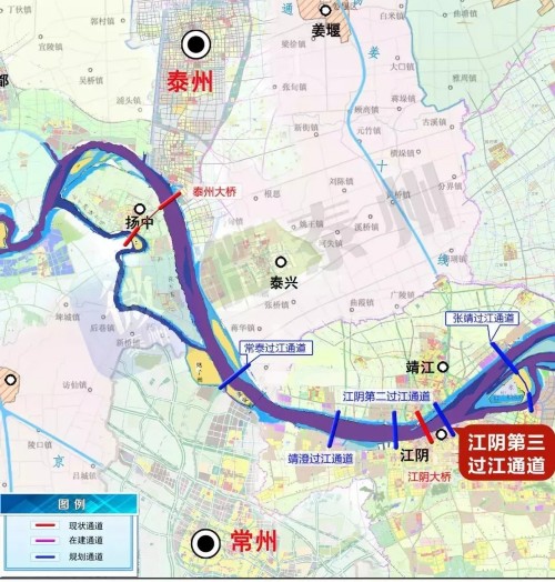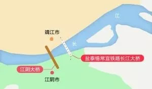 常泰过江通道位于泰州大桥与江阴大桥之间,距离上游的泰州大桥约32公里,距离下游的江阴大桥约27公里,为公铁合建过江通道。