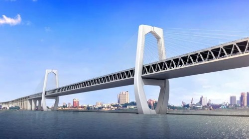 跨江大桥路线全长7km,拟建设下层四线铁路、上层双向八车道公路的公铁两用长江大桥跨越长江。